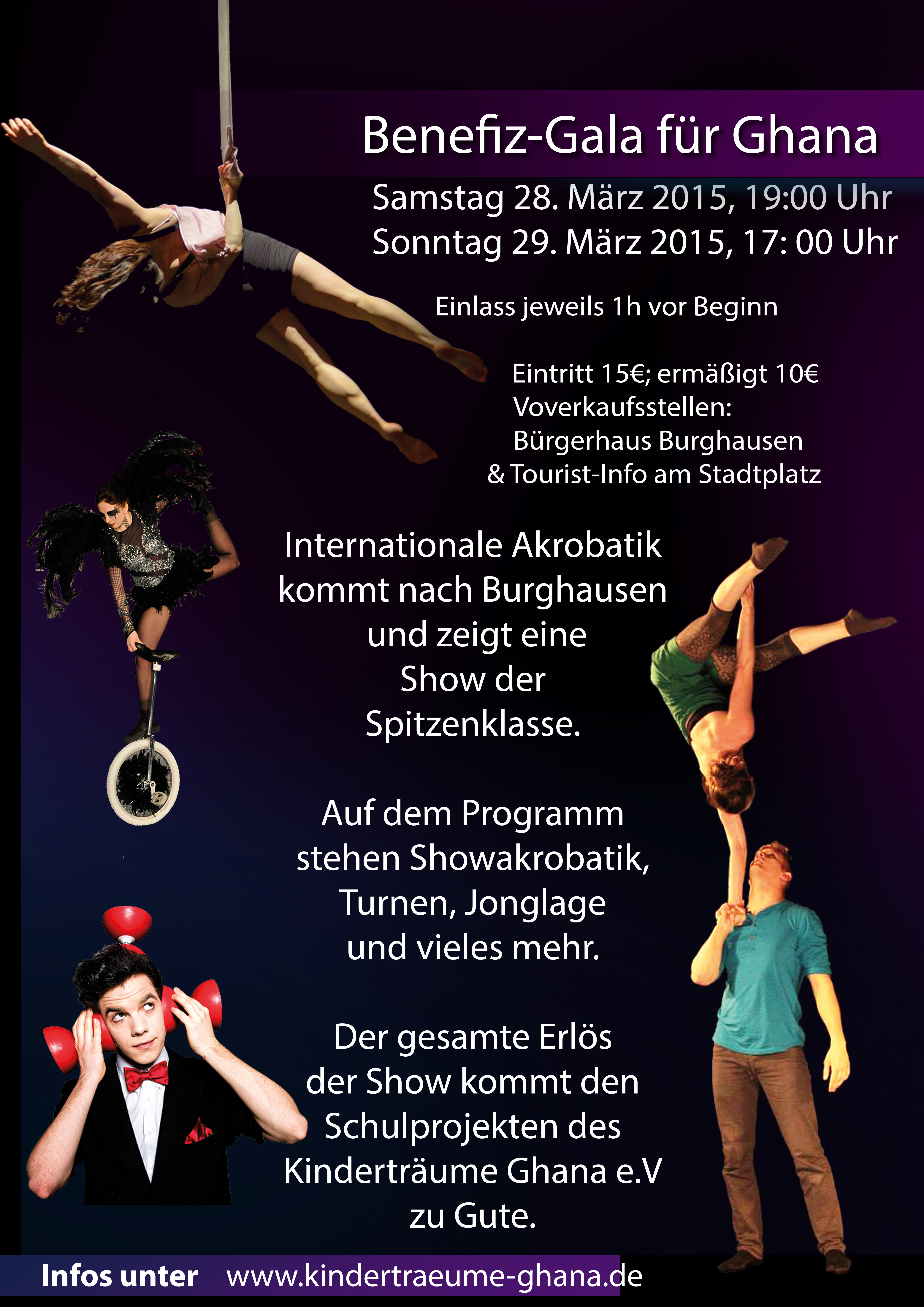 Nach dem großen Erfolg der Benefizgala für Ghana im März 2013 veranstaltet der Kinderträume Ghana e.V. seine zweite Benefizgala. Die absolut sehenswerte und abwechslungsreiche Show von 2013 soll noch einmal überboten werden. Dafür reisen Artisten aus Holland, Belgien und Frankreich an. Artisten aus Berlin und zwei regionale Gruppen sind auch dabei. Gezeigt wird Akrobatik, Showturnen, und Zirkuskunst vom Feinsten. Die auftretenden Künstler sind größtenteils professionelle Artisten die extra für diese Show den weiten Weg nach Burghausen auf sich nehmen. Sie treten nur für etwa ein Drittel ihrer normalen Gage auf. So kann der gesamte Erlös in die Projekte des Kinderträume Ghana e.V. fließen. Diesen spektakulären Abend sollten Sie sich auf keinen Fall entgehen lassen. Karten gibt’s im Vorverkauf im Bürgerhaus und der Tourist Info in Burghausen ab dem 01.12.2014.